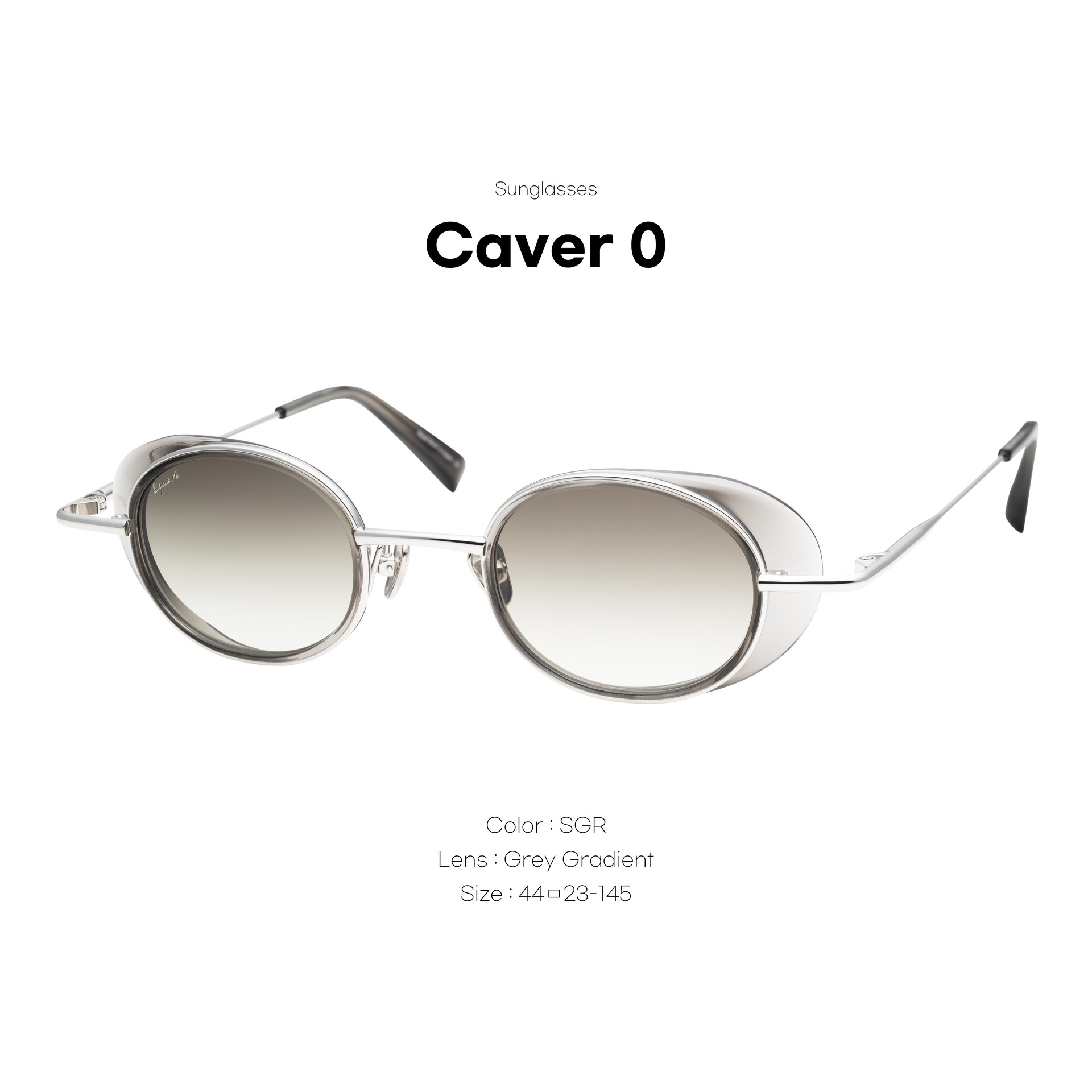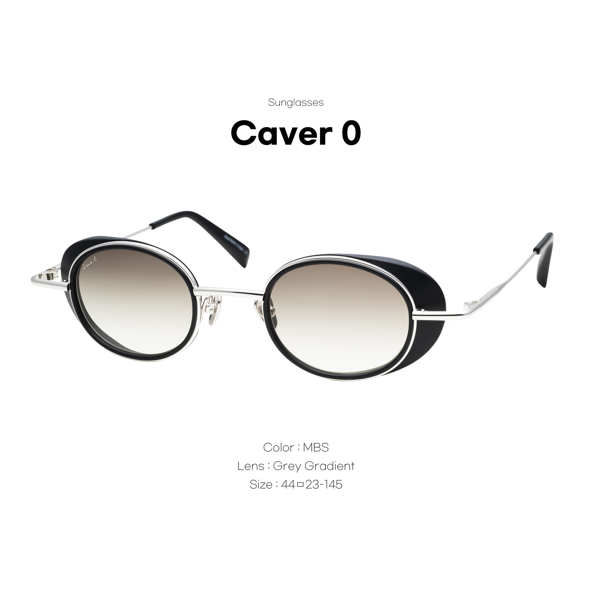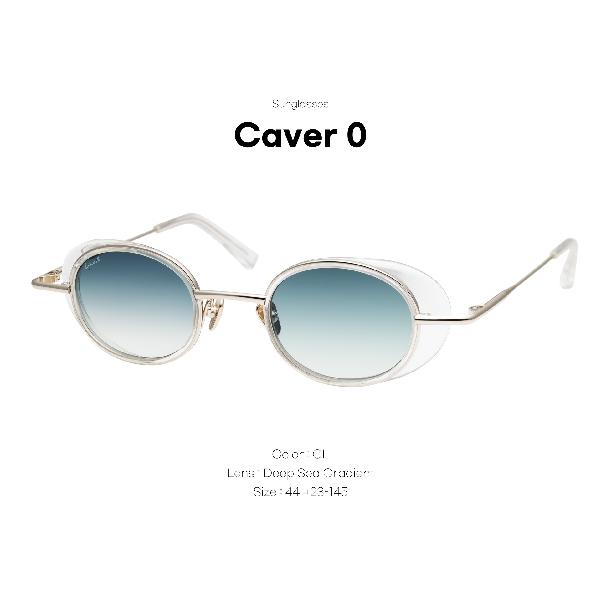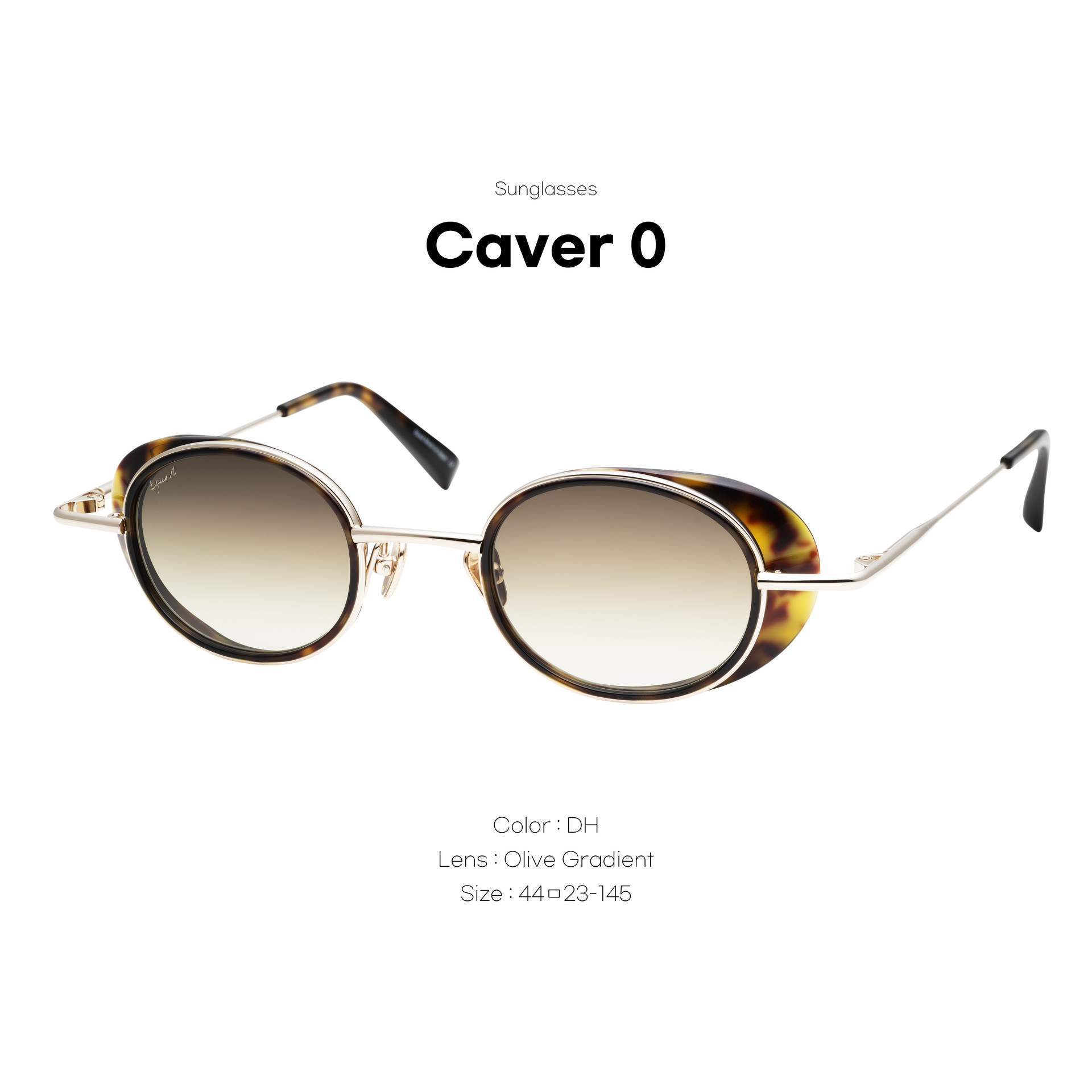 CAVER O 모델은 길쭉한 골드 메탈 페이스와 측면 실드를 갖춘 독특한 레트로 스타일을 연출하며, 그레이 그라데이션 오벌 렌즈와 매끄러운 블랙 아세테이트 내부 림이 특징입니다.